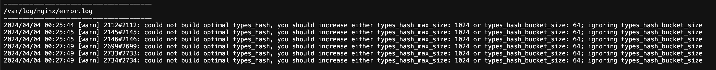 로그를 보니 nginx에서 types_hash 관련 에러가 발생했다.