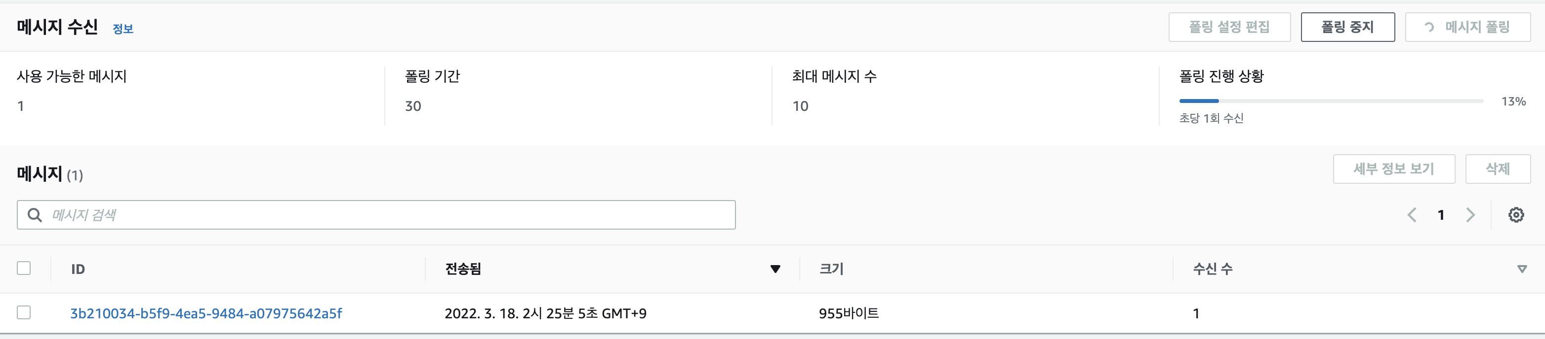 메시지 폴링 버튼을 누르면 메시지가 정상적으로 도착한 걸 확인할 수 있습니다.