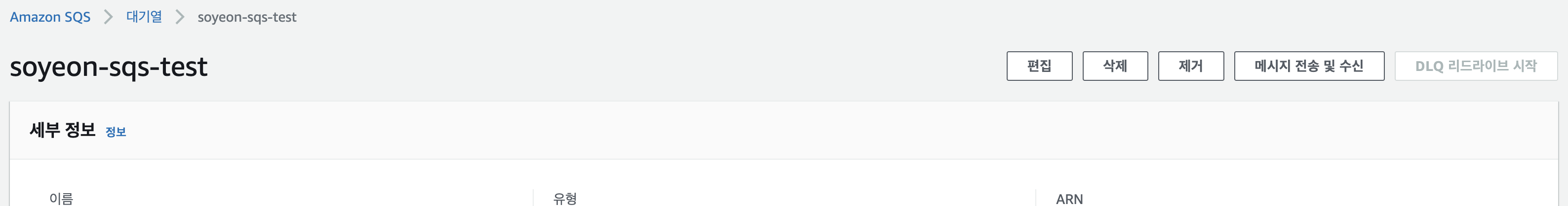 대상이 되는 sqs 를 선택해 들어간 다음 오른쪽 상단에 있는 메시지 전송 및 수신 버튼을 클릭 하고