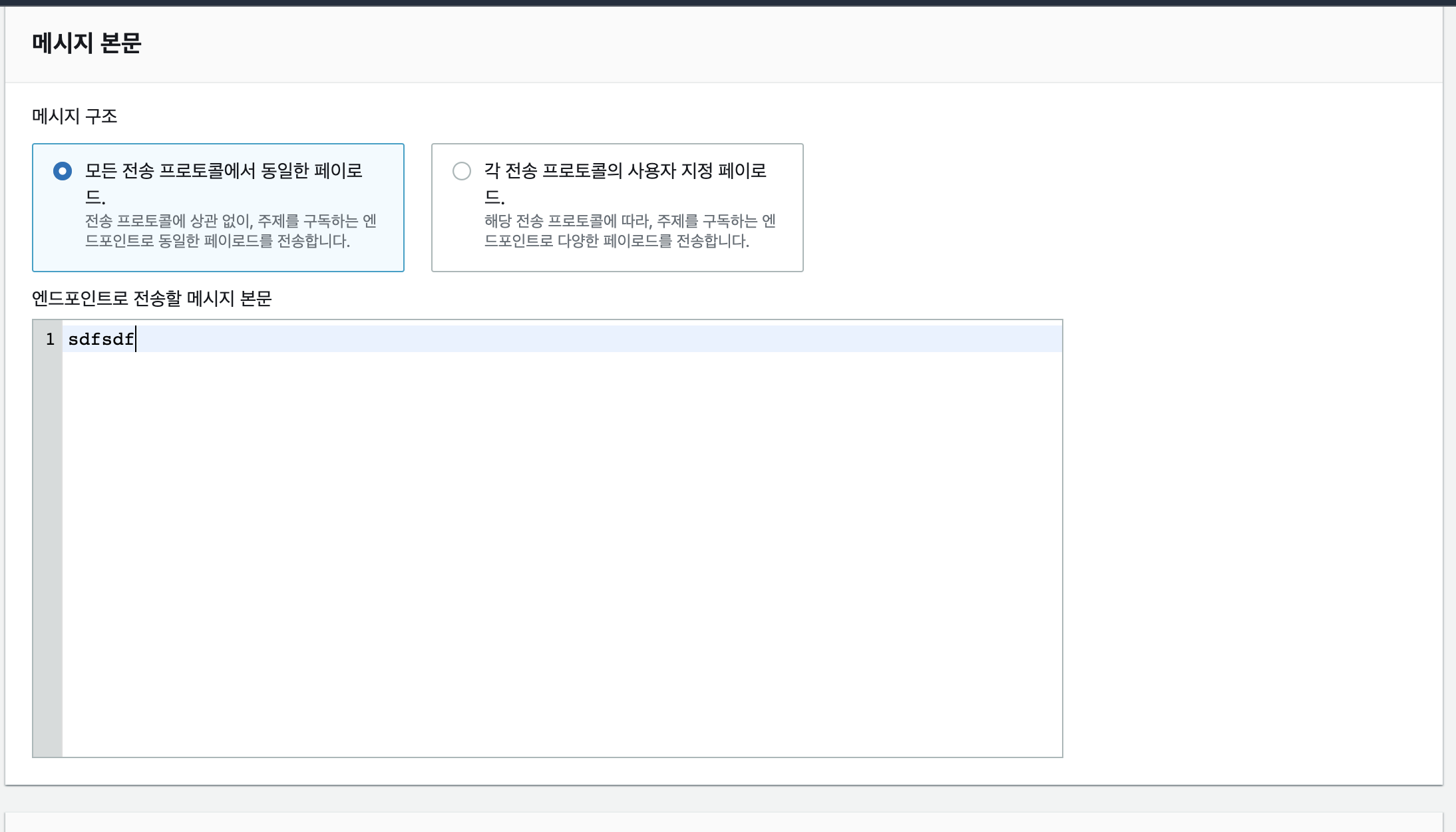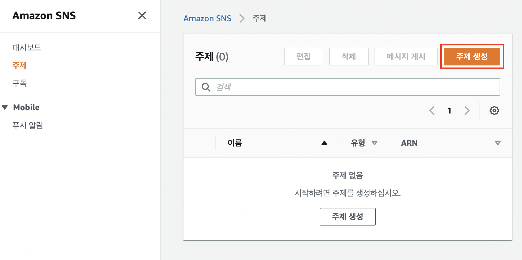 SNS > 주제에서 주제 생성 버튼을 눌러줍니다.
