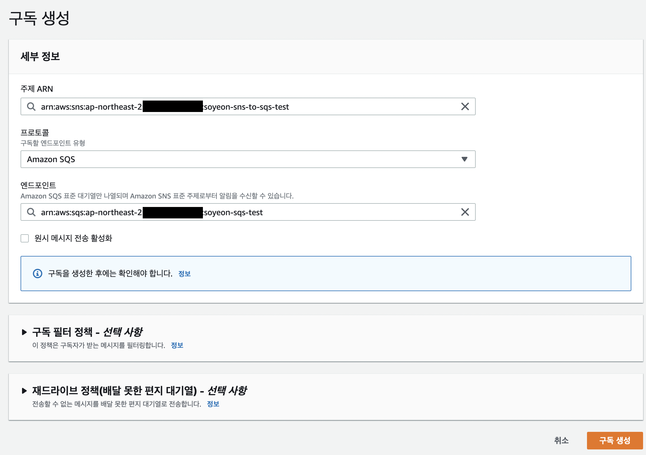 구독 ARN은 이미 선택되어 있기 때문에 프로토콜을 Amazon SQS, 엔드포인트를 이전에 만든 SQS로 설정해줍니다.