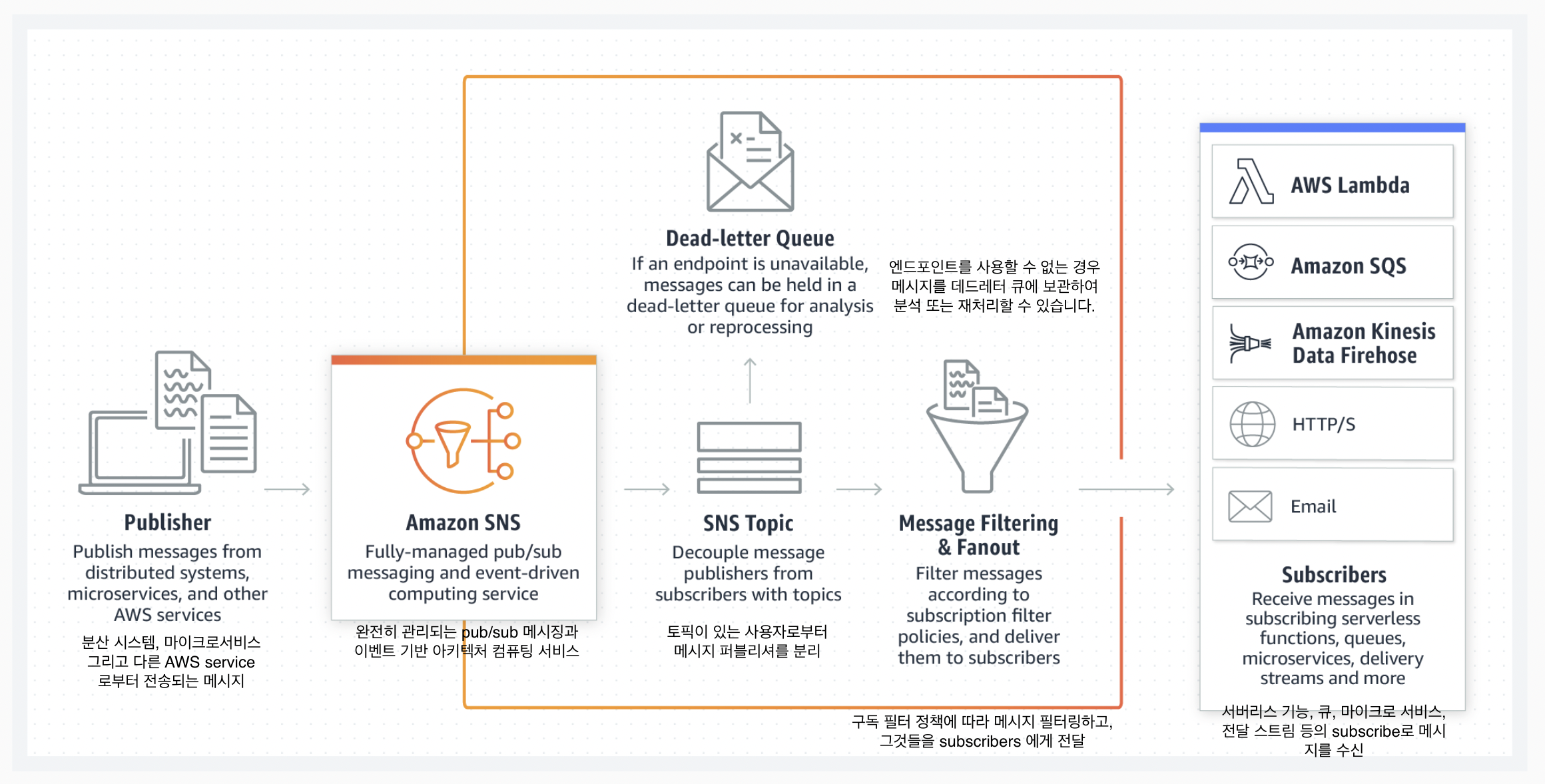 | 엄격하게 보존된 메시지 순서 지정 정확히 1회 메시지 전송 높은 처리량, 초당 최대 300회 게시 구독 프로토콜: SQS ➡️ 메시지 순서 지정 및 중복 제거시 사용 SQS FIFO 인 경우에만 연결 가능 | 최선의 메시지 순서 지정 최소 1회 메시지 전송 가장 높은 처리량(초당 게시 횟수) 구독 프로토콜: SQS, Lambda, HTTP, SMS, 이메일, 모바일 애플리케이션 엔드포인트 ➡️ 메시지 전송 순서 및 가능한 메시지 중복이 중요하지 않은 경우 사용 엔드포인트로 여러개를 지정할 수 있어 보통 많이 사용함 |