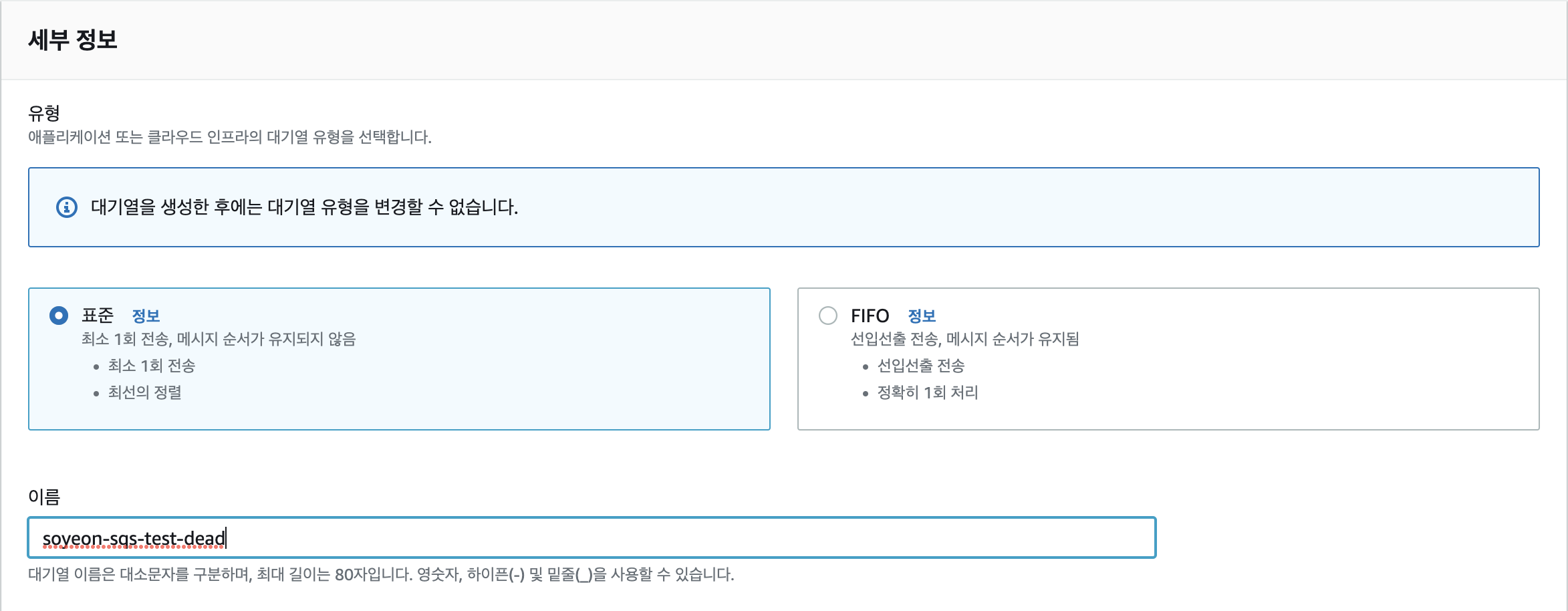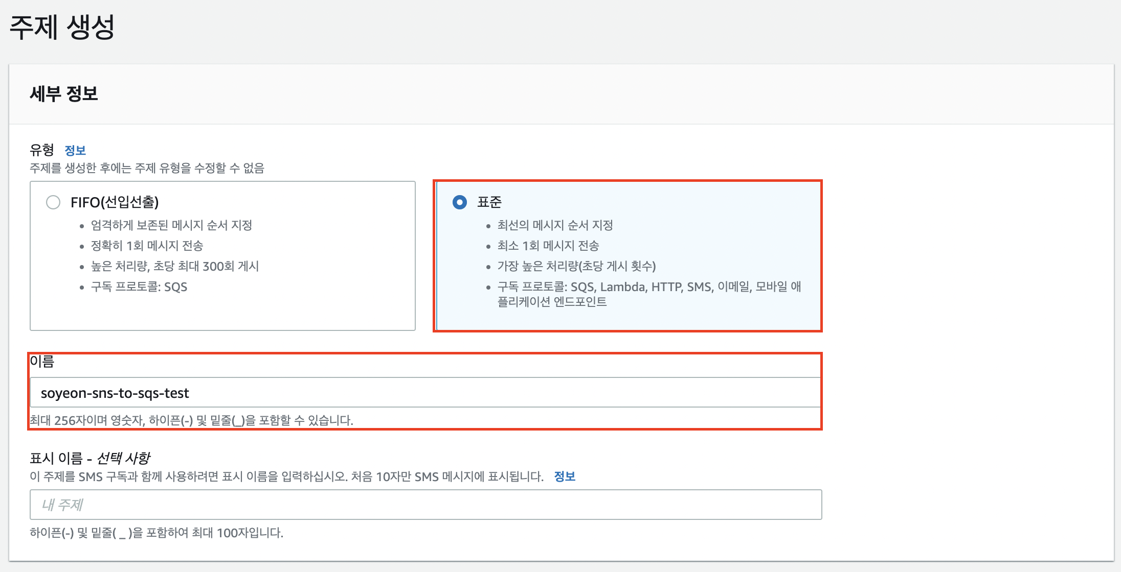 저는 정확히 1회, 순서를 지켜서 메시지를 받을 필요가 없기 때문에 유형은 표준으로, 이름은 임의로 지어주도록 하겠습니다. sns와 sqs 가 통신하기 때문에 soyeon-sns-to-sqs-test 로 지어줬습니다.