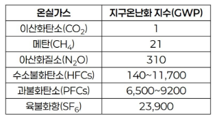 - GWP(Global Warming Potential): 온실가스마다 지구온난화에 기여하는 정도를 수치화한 것. CO₂=1 기준. 예: 메탄은 약 28배.