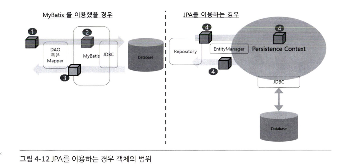 JPA는 JPA만의 고유한 메모리 공간(이하 context)을 이용해서 엔티티 객체들을 관리한다. 기존의 MyBatis 방식과 비교하면 다음과 같다.