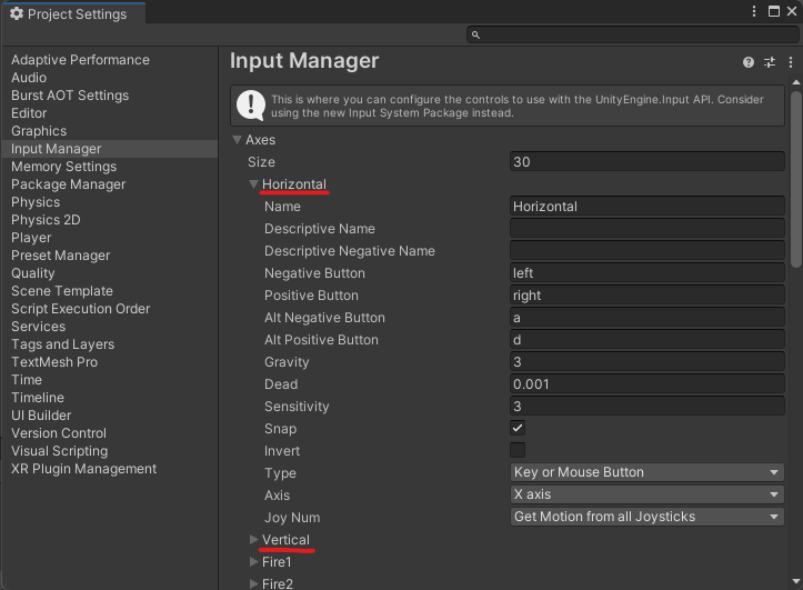 을 의미한다. 사진에서 볼 수 있듯, Horizontal은 left, right / a, d 버튼으로 조절이 가능하다고 한다. (얘가 기본 값이고 버튼 수정도 가능하다.)