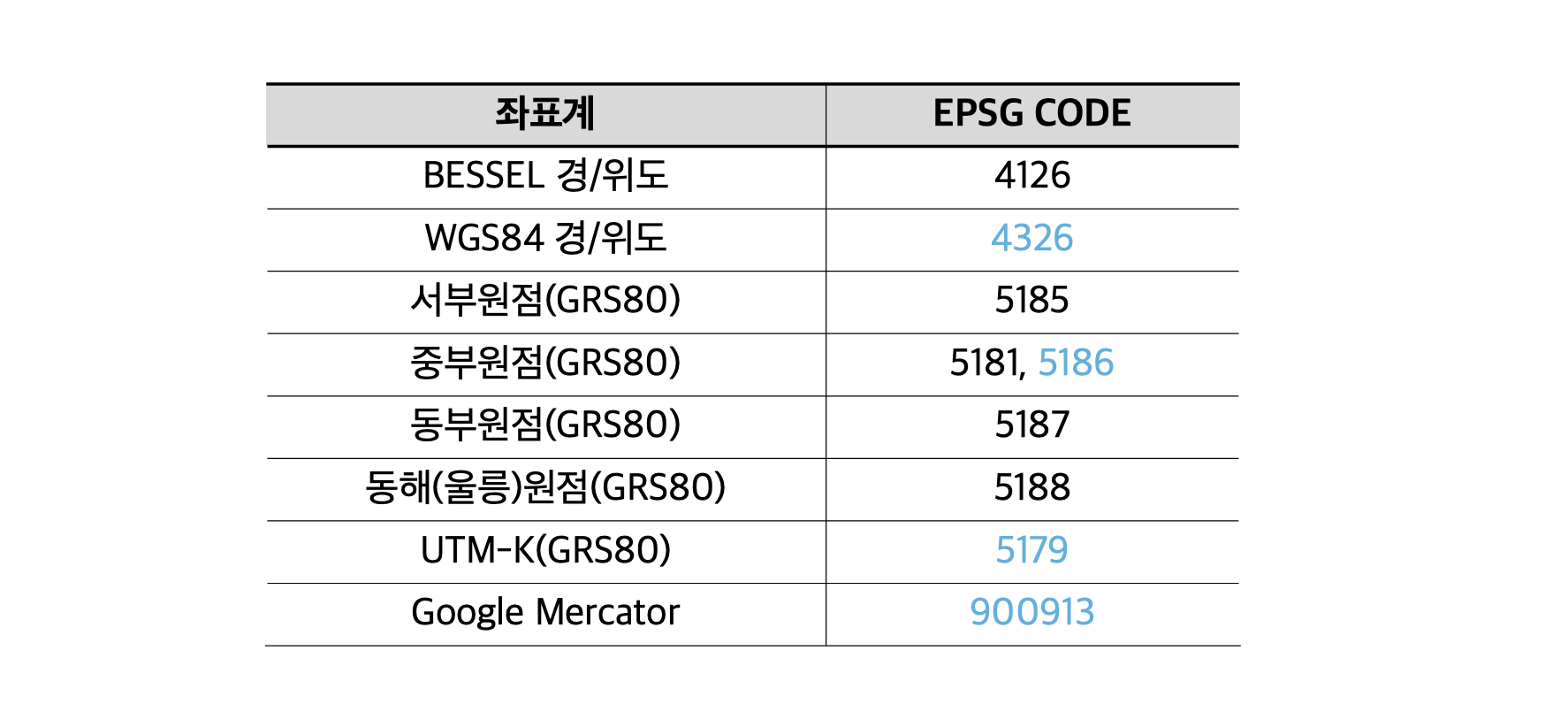 드디어 오늘의 메인이 나왔다. EPSG 코드를 정리하려고 글을 쓴 건데, 앞 부분을 이해하며 넘어오다 보니 생각보다 글이 길어졌다.