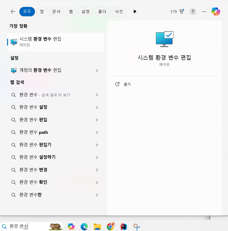 요즘 윈도우 정말 친절하게도 검색 창에 환경 변수만 입력하면 바로 나와준다. 시스템 환경 변수 편집을 눌러서 환경 변수 편집 창으로 빠르게 이동하자.