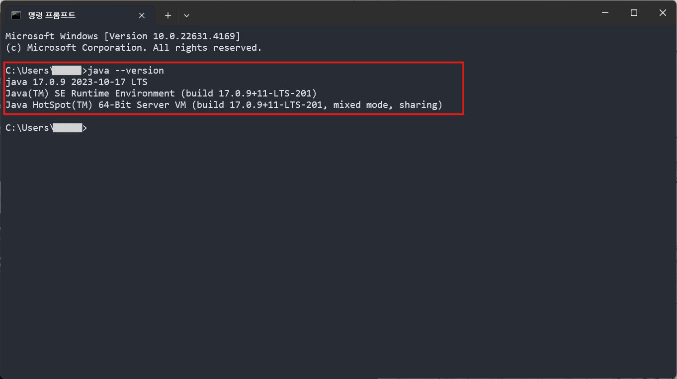마지막으로, JDK가 잘 설치 됐는지, 그리고 환경 변수가 잘 등록됐는지를 확인해보자. cmd 창을 열어 java --version이라는 명령어를 입력해보자.