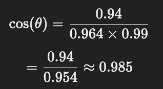 return dot_product / (norm_vec1 * norm_vec2) # 공식 적용