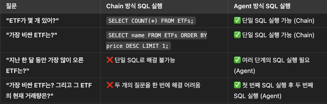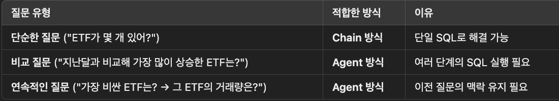 2️⃣ Agent 방식 → 복잡한 질문, 연속적인 질문, 분석적인 질문에 필요 (여러 개의 SQL 실행)