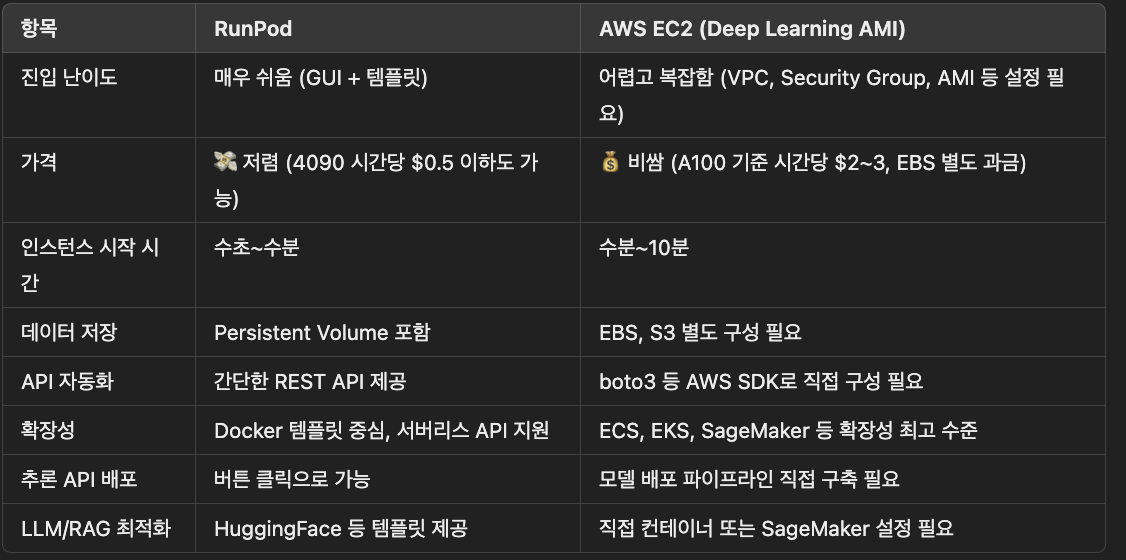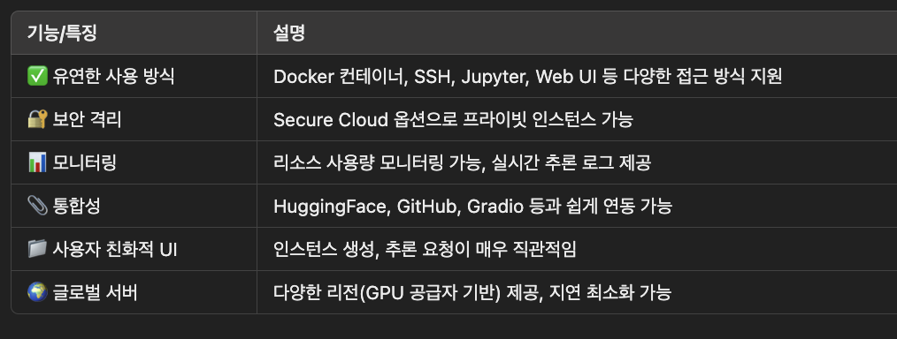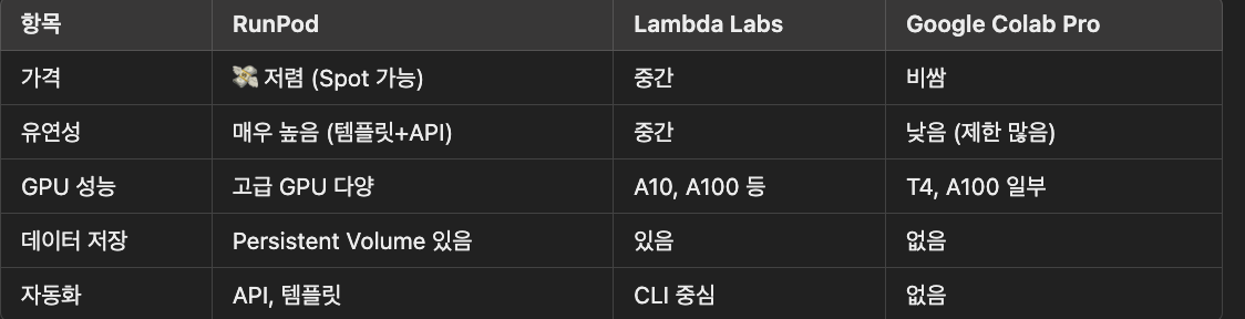 RunPod는 사용자가 저렴하고 유연하게 GPU 인스턴스를 사용할 수 있도록 지원하는 GPU 클라우드 인프라 서비스다.
