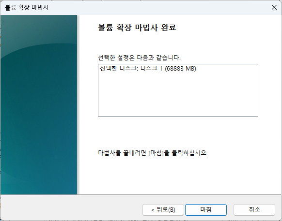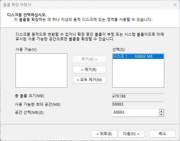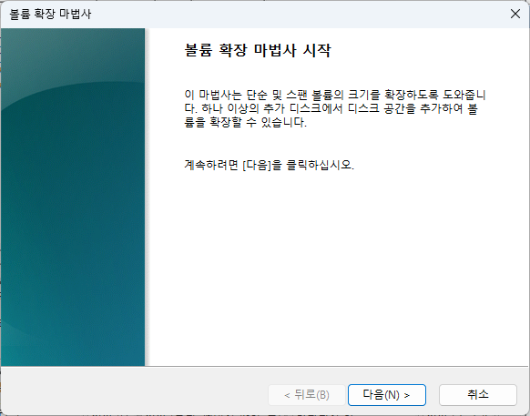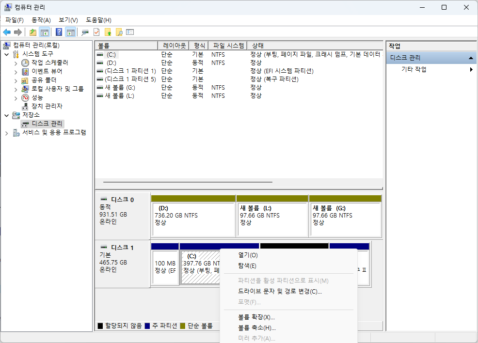 기존 C 드라이브 영역 오른쪽 버튼 클릭 후 볼륨 확장 클릭