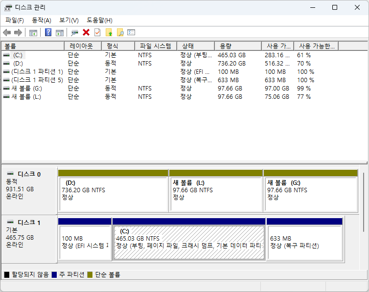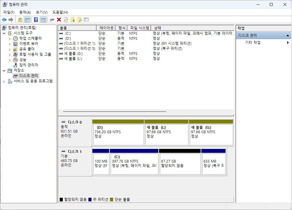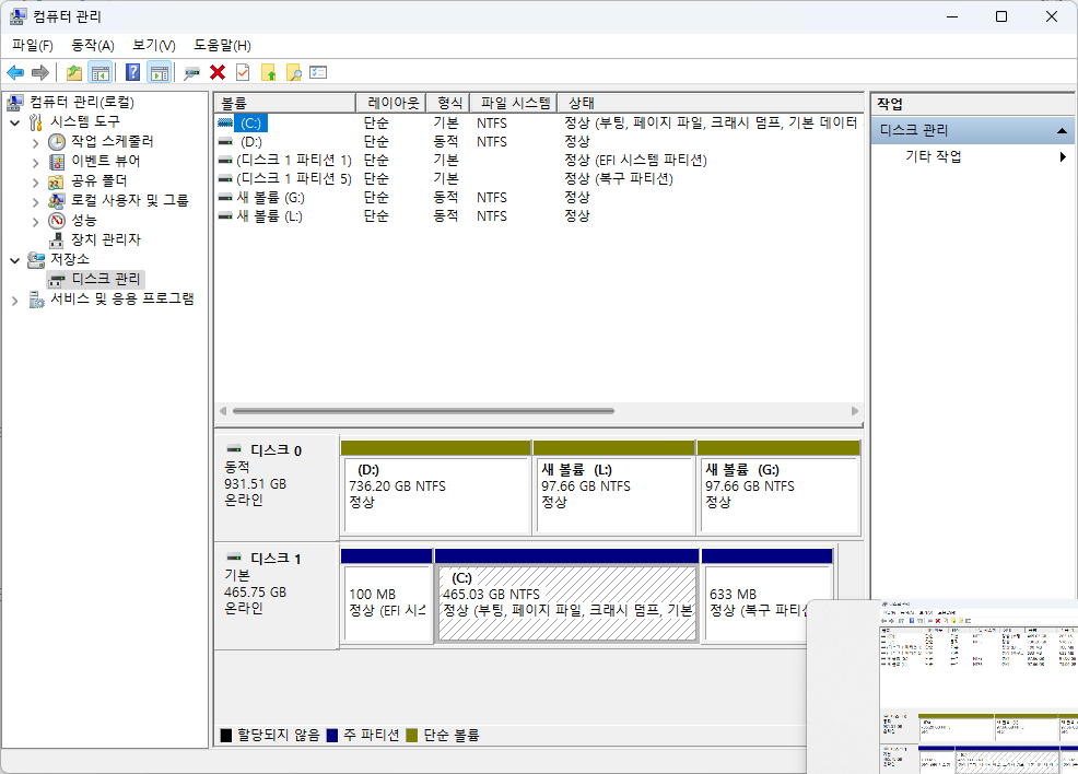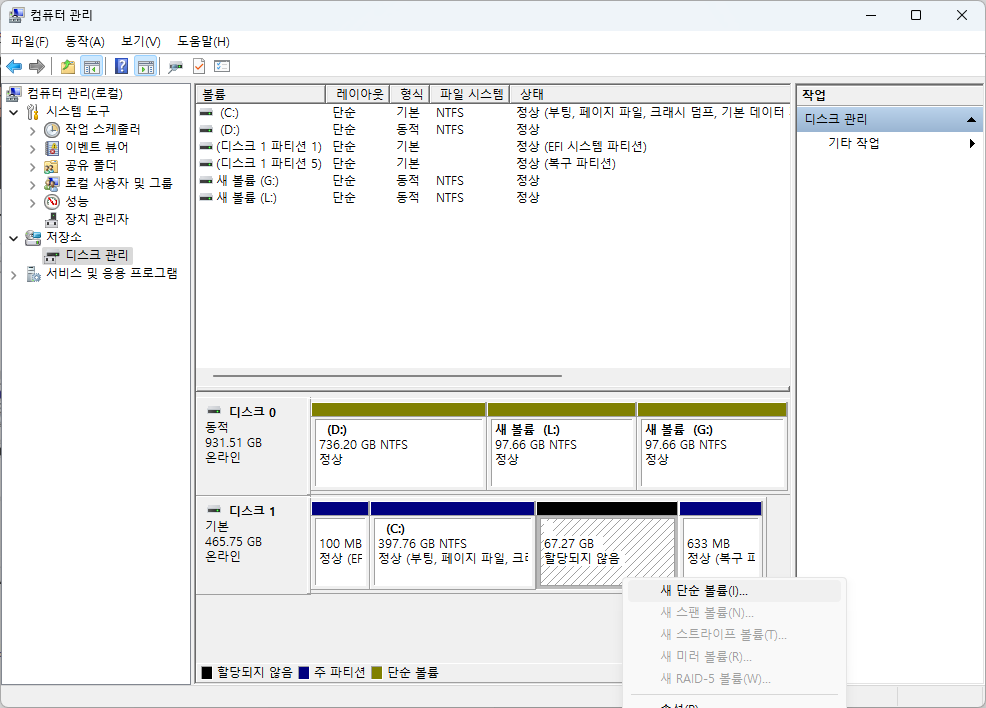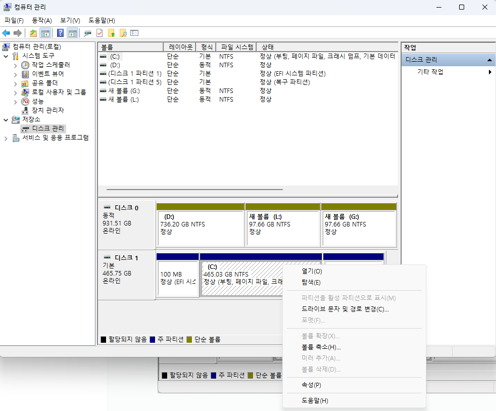 또는 마우스 오른쪽 클릭 -> 디스크 관리