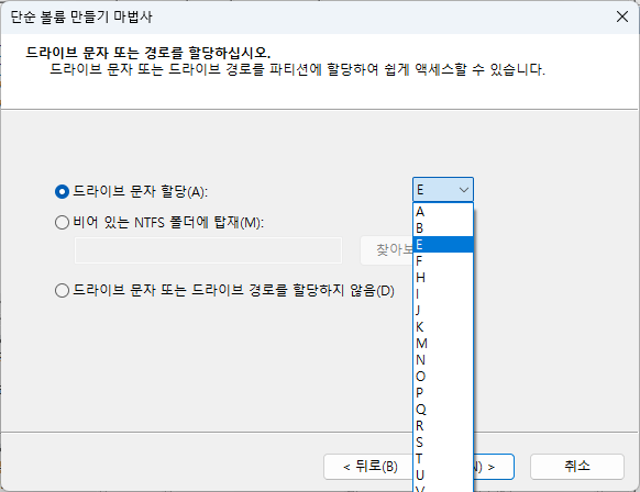 드라이브 문자 원하는 문자로 선택 후 다음
