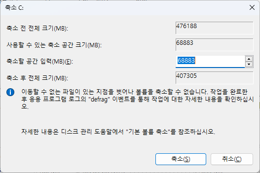 분할을 원하는 디스크 영역 마우스 오른쪽 버튼 클릭 후 볼륨 축소 클릭