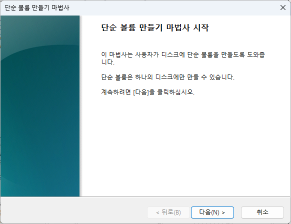 축소해서 생성된 할당되지 않음 영역 마우스 오른쪽 버튼 클릭 후 새 단순 볼륨 클릭