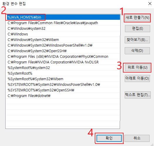 새로 만들기를 클릭하여 %JAVA_HOME%\bin을 입력한 후 위로 이동 버튼으로 가장 위에 위치시킴