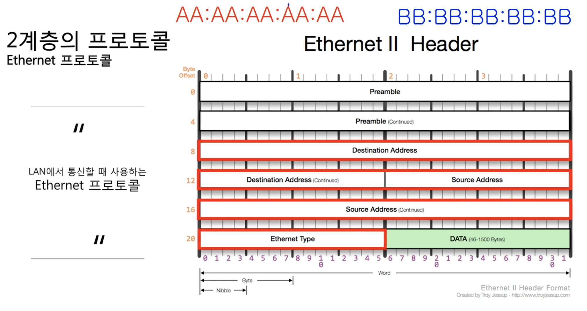 목적지 MAC주소 6byte, 출발지 MAC주소 6byte, 상위 프로토콜 정보 2byte