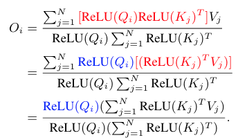 Then, it is useful that the associative property of matrix multiplication to reduce the computational complexty and memory footprint from quadratic to linear without changing its functionality
