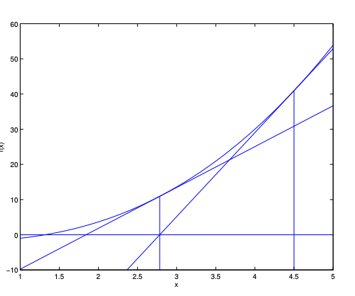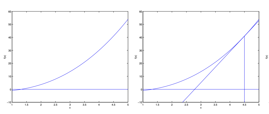시작 f(x)와 1st step입니다. x를 4.5로 initialize한다면, tangent line을 그려서 f(x)=0이 되는 선을 그려서 x를 f(x)가 0이 되는 x의 값으로 가깝게 갈 수 있습니다.