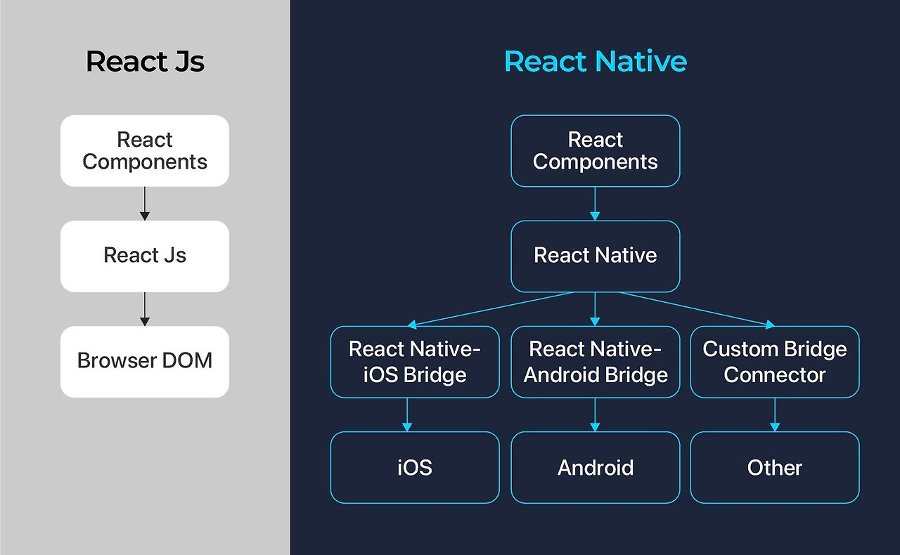 React Native와 네이티브 사이에 있는 Bridge를 통해 하나의 코드로 iOS와 Android 앱 개발이 가능함