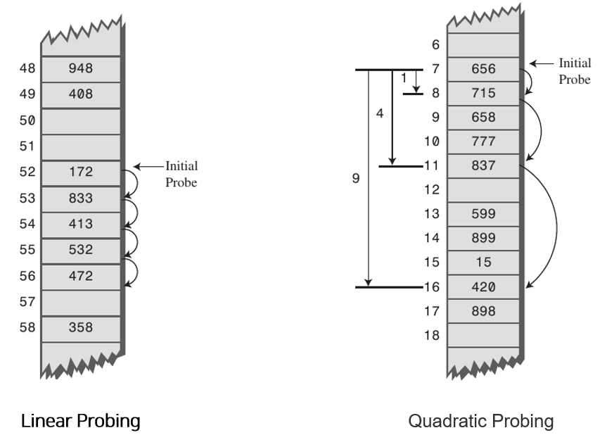 고정 폭 만큼씩 이동하는 linear probing, 이동 폭을 제곱으로 늘려 나가는 quadratic probing (1^2 -> 2^2 -> 3^2 ...), hash된 값을 다시 hash하는 double hashing probing 등이 있다