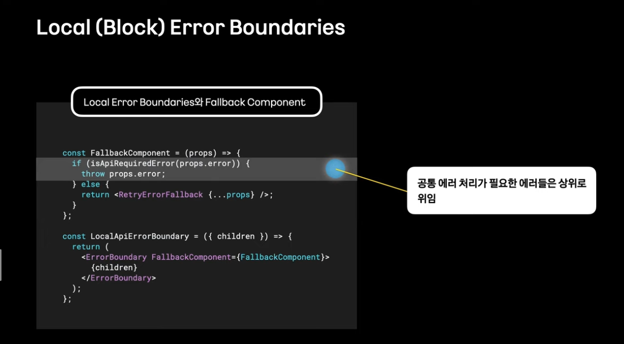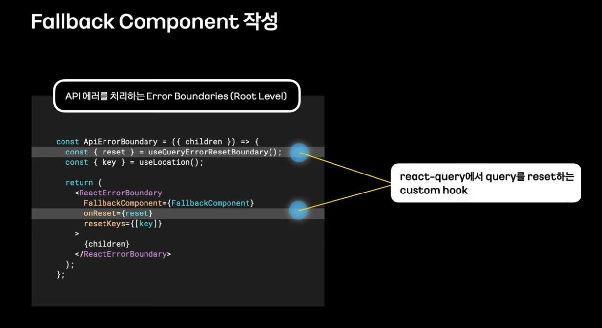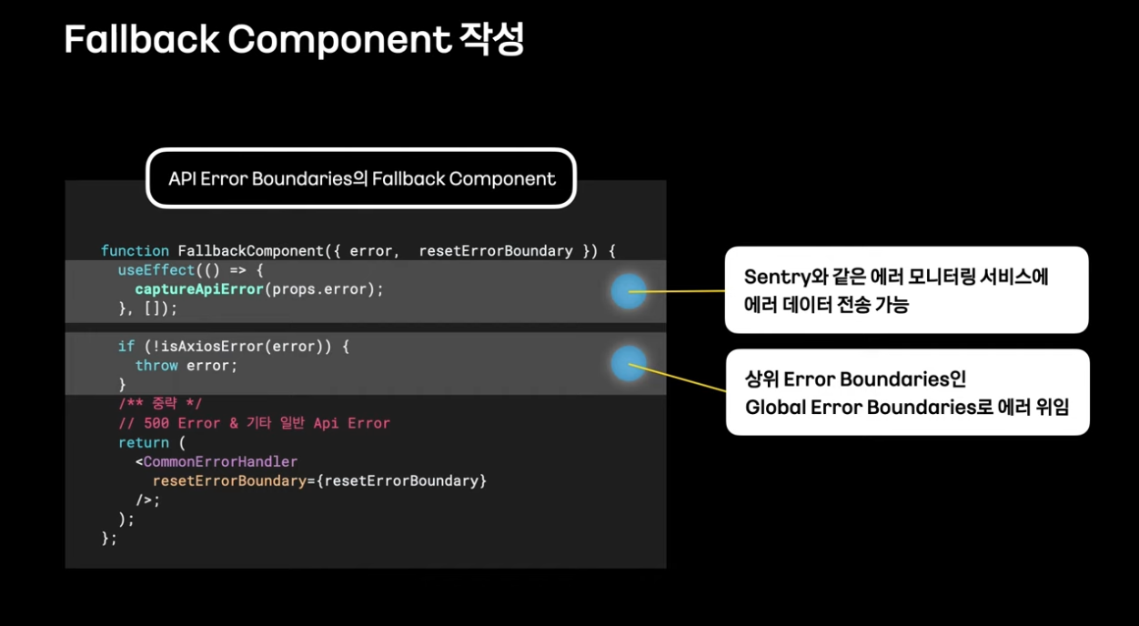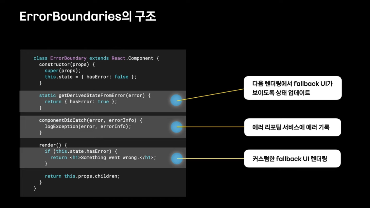 error boundaries를 활용하여 하위 컴포넌트 트리의 자바스크립트 에러를 포착하고 FallBack UI를 보여줄 수 있음