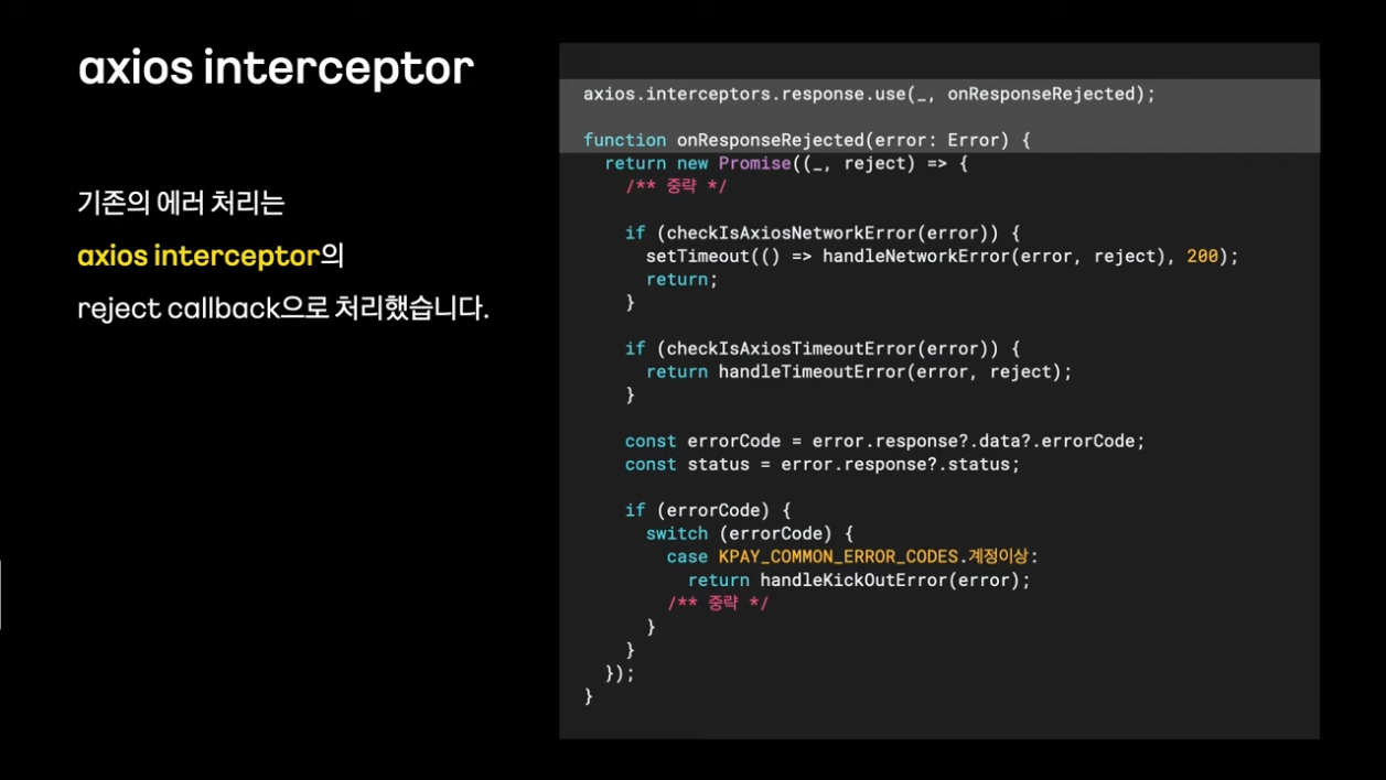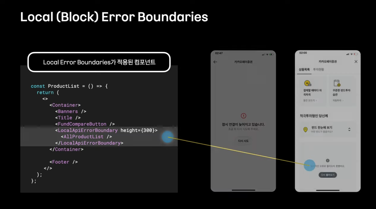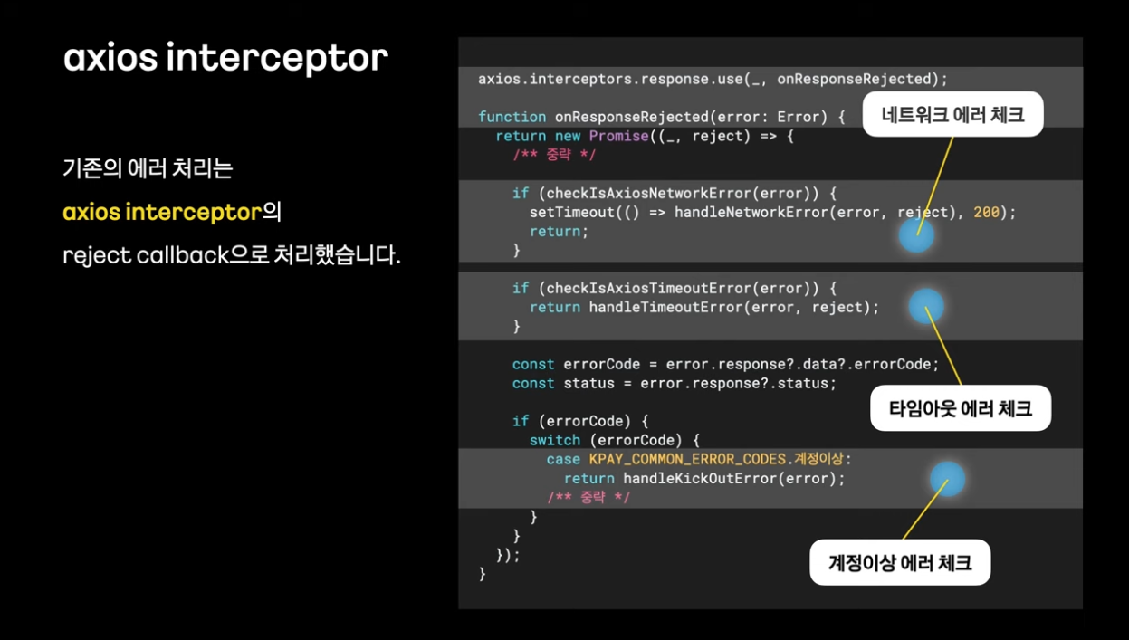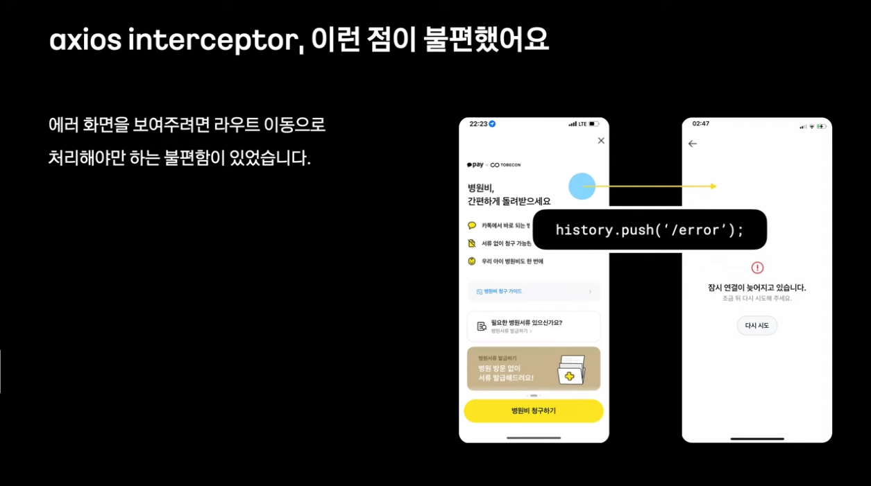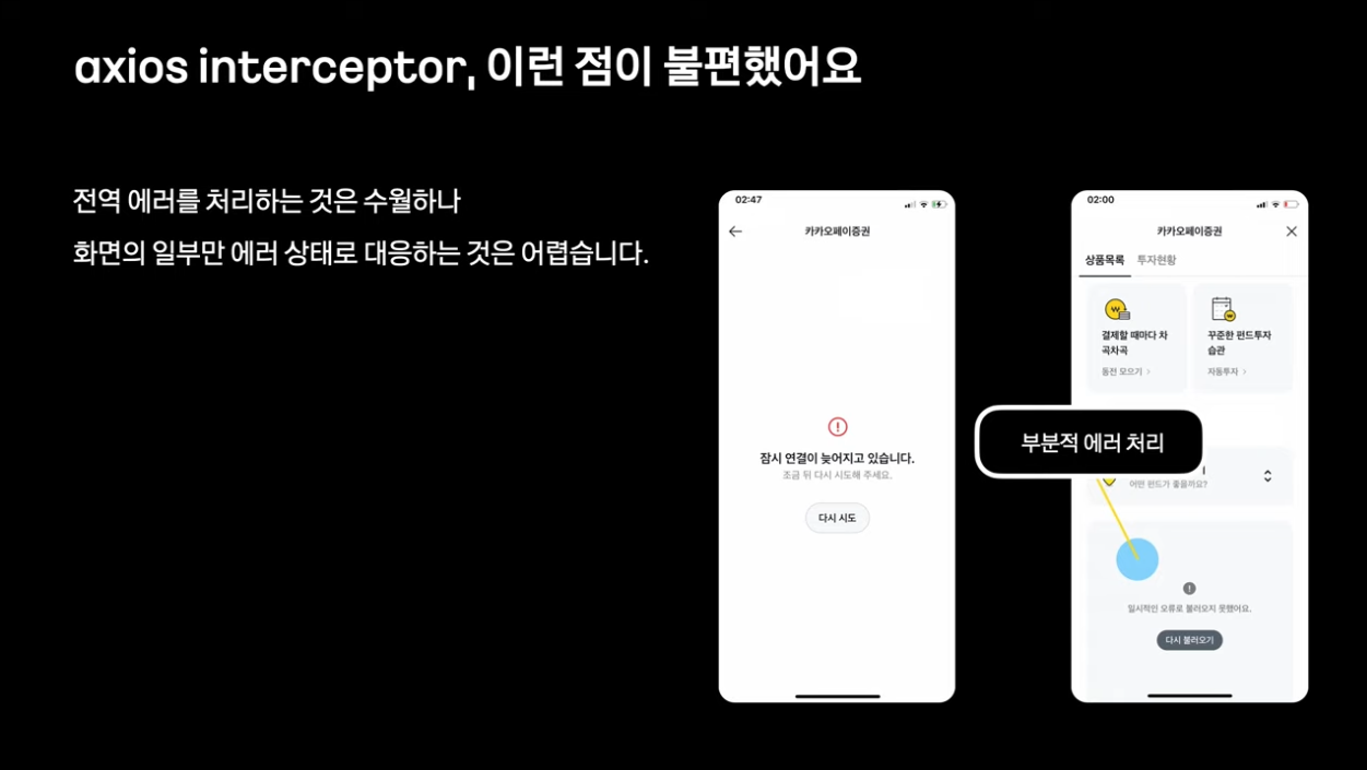 여러가지 에러/ 예외 케이스들이 있을 때 오류가 발생하면 axios interceptor를 사용해서 일괄적으로 라우트 이동을 시켜서 에러 핸들링을 하고 있었음 -> 1/ 라우트 이동으로 처리해야만하는 불편함, 2/ 전역 에러를 처리하는 것은 수월하나 화면의 일부만 에러 상태로 대응하는 것은 어려웠음