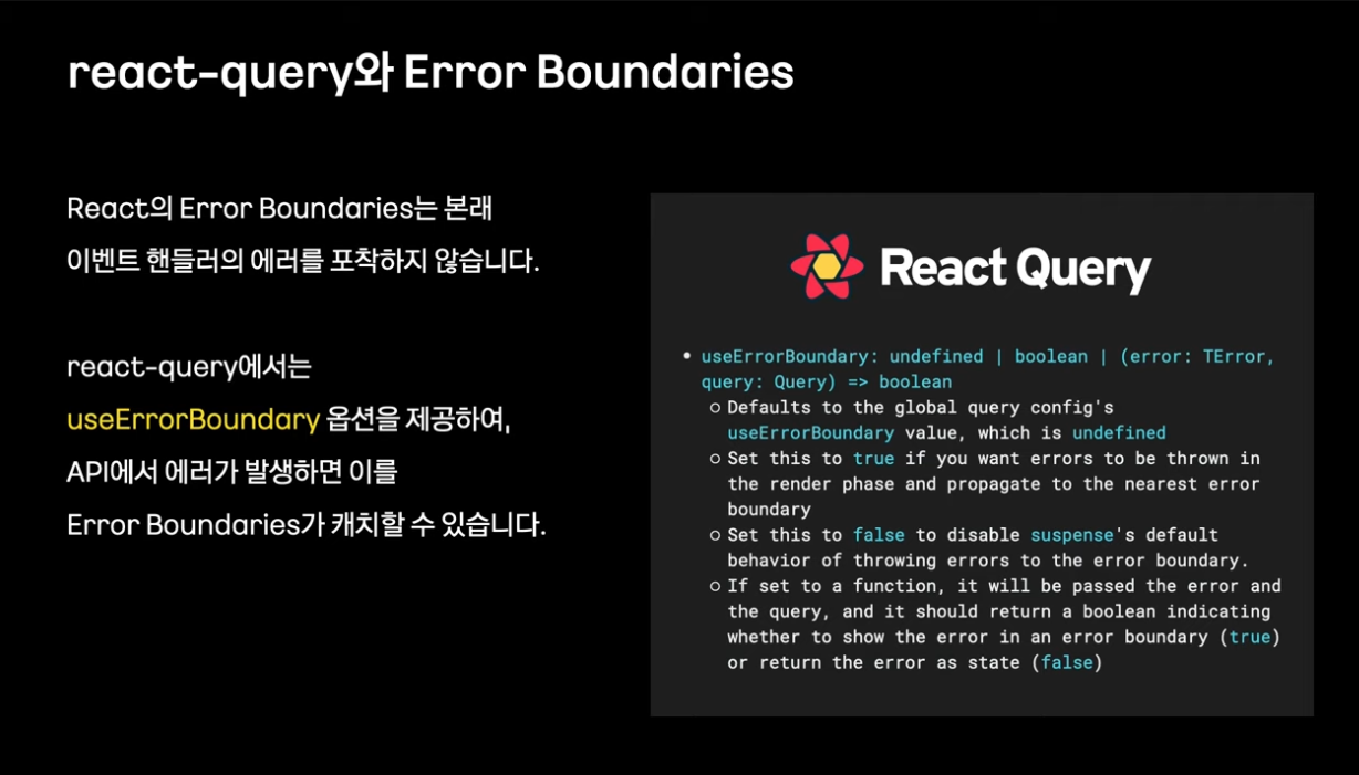 useErrorBoundary 옵션을 제공하여, API에서 에러가 발생하면 이를 에러바운더리가 캐치할 수 있음
