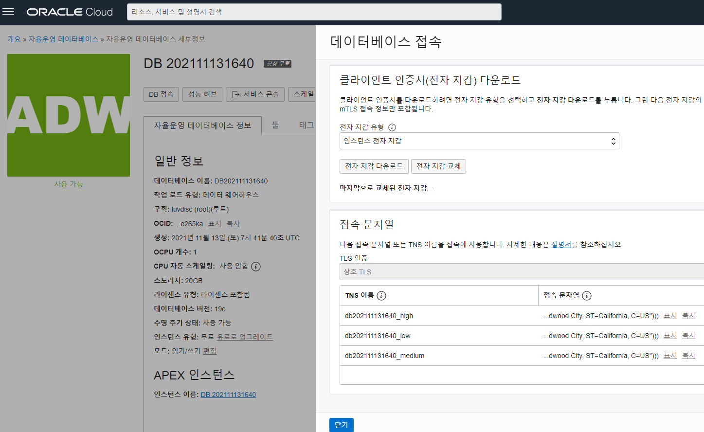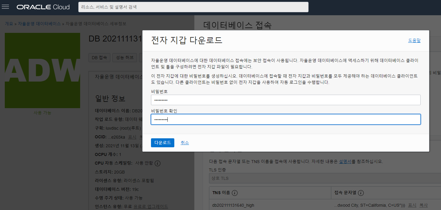 Oracle Cloud에서 재공하는 OracleDB에서는 전자지갑을 이용한 접속을 지원 합니다.