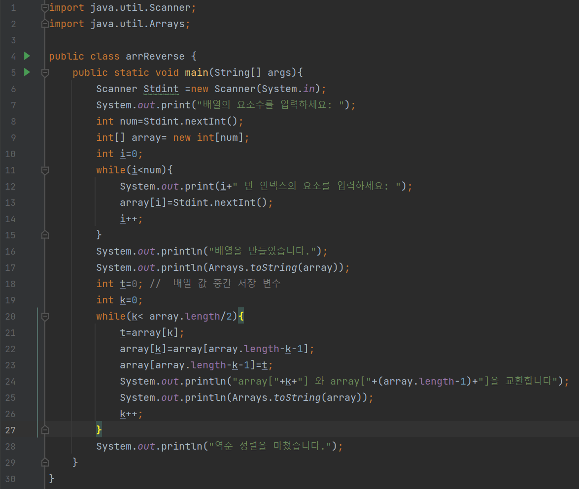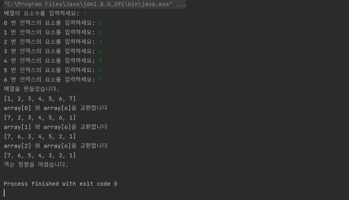 배열의 요소수, 요소를 입력하고 각 교환마다 중간 결과를 출력하고 마지막에 역순으로 정렬된 배열을 출력해주는 프로그램을 만들어 보았다.