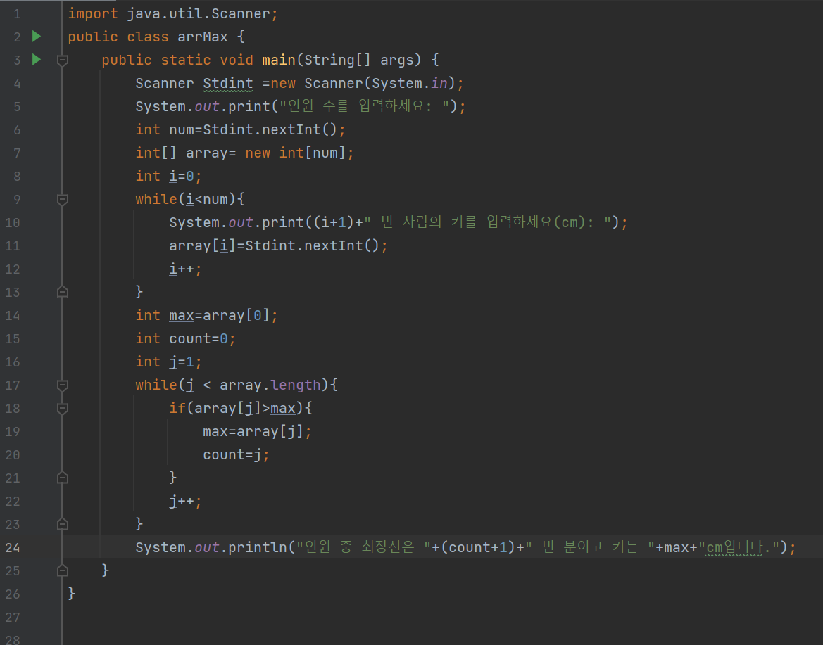 # 14~22:변수 max에 초기 값인 0번 인덱스를 넣어주었고 값이 최대인 인인덱스넘버를 찾기 위한 변수 count를 선언해주었다. 그리고 while문 에서 각 인덱스 값과 max 를 비교하면서 만약 해당 인덱스 값이 max보다 크다면 max를 해당하는 인덱스 값으로 새로 선언해주고 count에 인덱스 넘버를 넣어주었다.