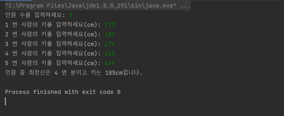 인원 수 및 키를 입력한 후 자동으로 최장신을 찾아주는 프로그램을 최댓값 찾기 알고리즘을 이용하여 만들어 보았다.
