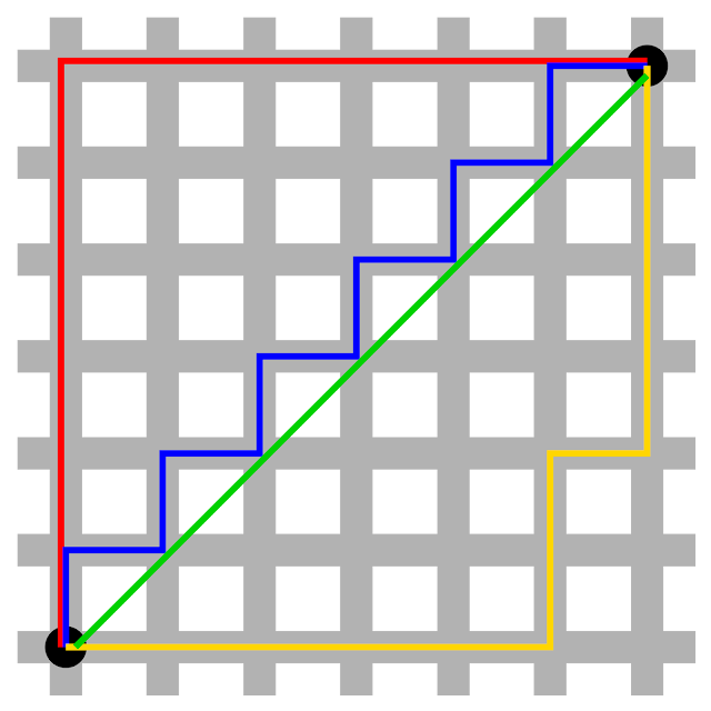 맨하탄 거리는 직교 좌표계에서 벡터 p,q 사이의 거리를 일정한 좌표축의 점들 사이의 선분 길이의 합이다.