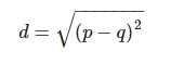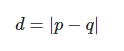 n차원 직교 좌표계에서 벡터 p,q 가 존재할때 이 두점 p,q의 거리를 구하는 공식은 아래와 같다.