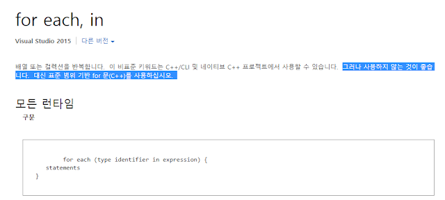 그 중에서 for each 는 VC++ 에서만 사용가능하지만 사용하지 말라고 대놓고 써놨다.