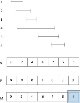 do M[i]=max( V[i] + M[ P[i] ] , M[i-1]);