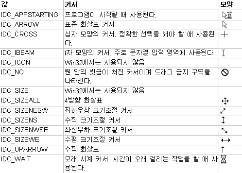 커서 변경m_cursor = LoadCursor(nullptr, IDC_ARRAW);