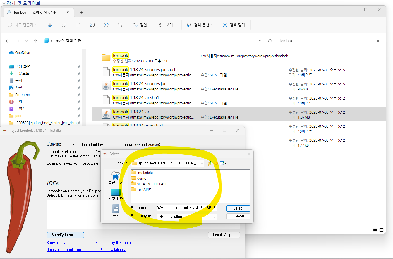 2) 사용자 > m. > lombok 검색 후 jar 실행