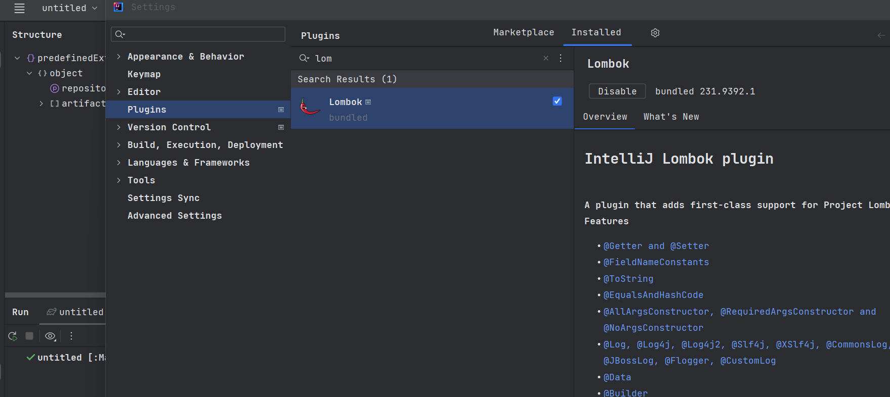 인텔리J 에서는 플러그인으로 lombok이 기본으로 설치되어있다.(활성화 체크박스 클릭)