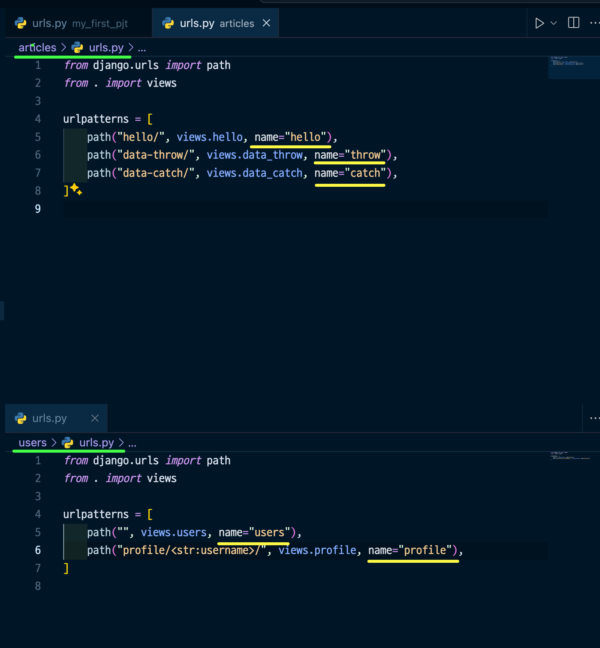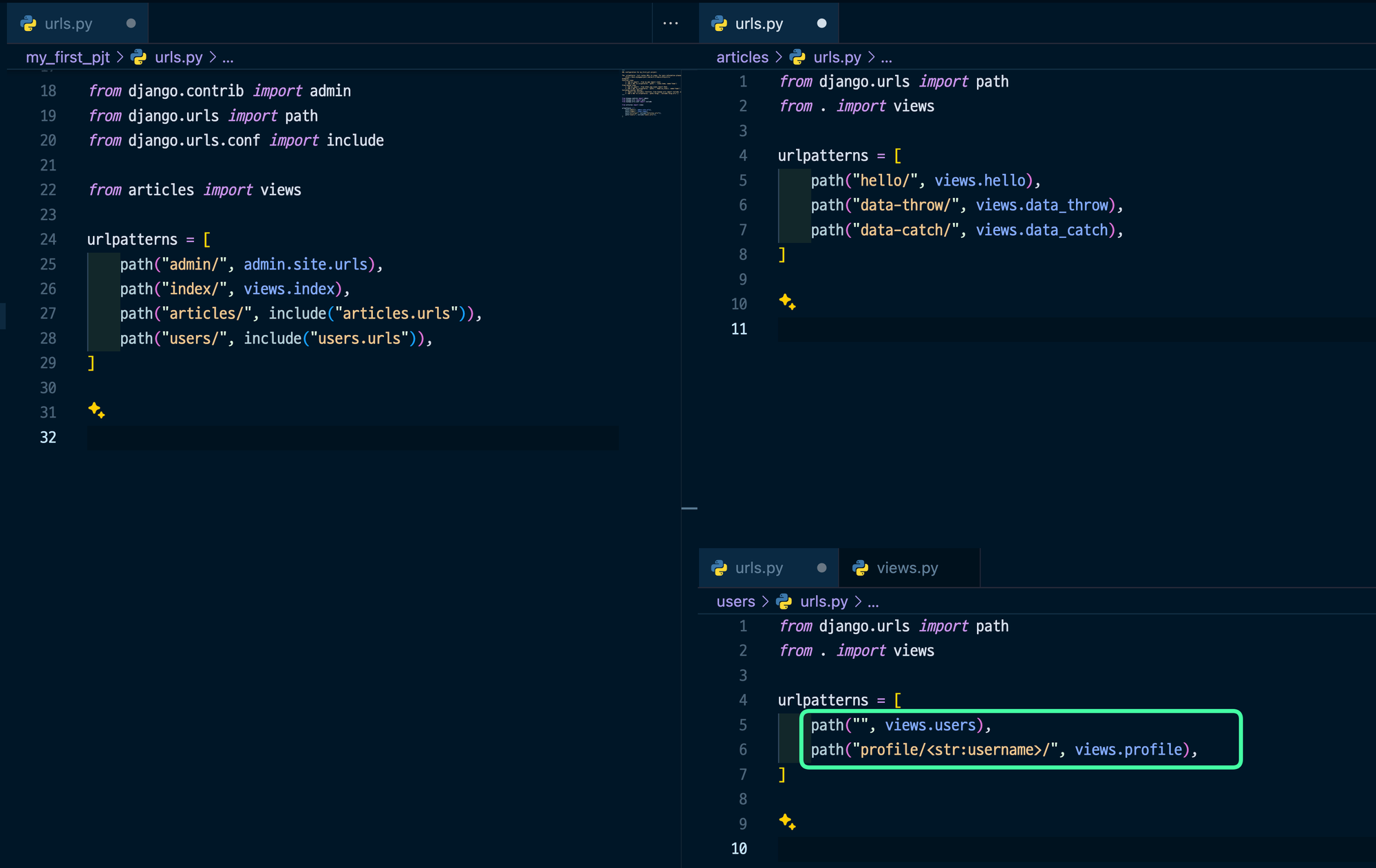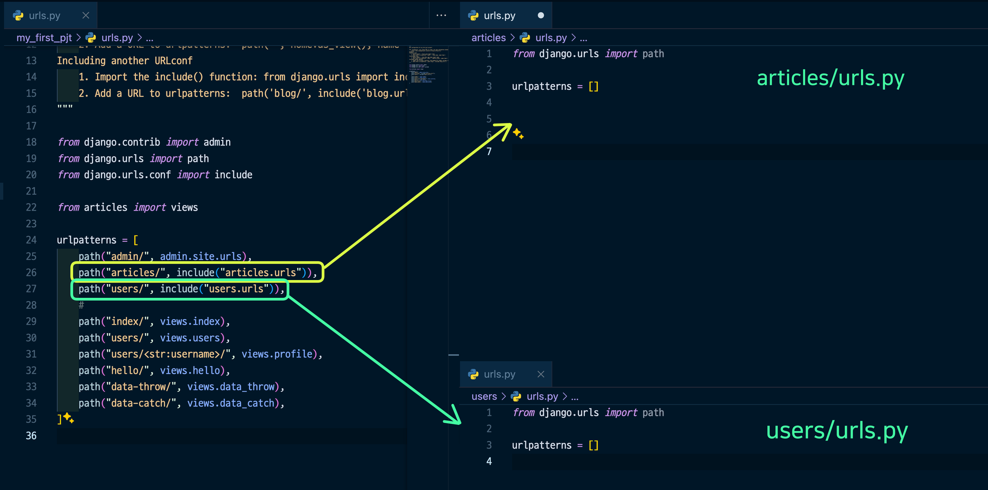 my_first_pj/urls.py에서 "articles/" 또는 "users/"가 잘렸을테니, ""이라고 해주는거임.