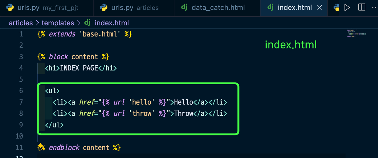 여기서 app의 urls path에 name을 지정해주면, 경로 이름을 외우지 않아도 되고 경로 이름을 바꿔도 유지됨.(경로 의존성 낮아짐)