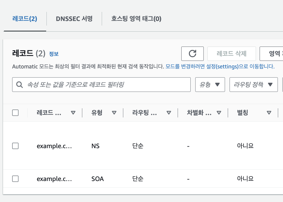 이렇게 두 개의 레코드를 만들어보았고, 호스팅 영역을 삭제해보자. 호스팅 영역을 삭제하려면 NS,SOA 유형레코드를 제외한 나머지 레코드를 삭제해야한다.