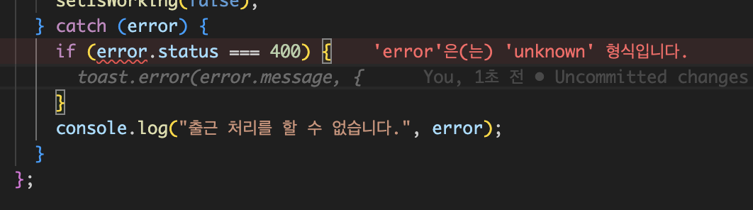 catch문에서 잡히는 모든error는 기본적으로unknown타입이기 때문에,error.message와 같은 속성을 직접 접근하면 TypeScript 에러가 발생한다.