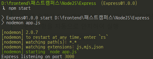 nodemon이 설치 되어있지 않은경우 start에npx nodenom 파일명시 자동설치 및 실행가능