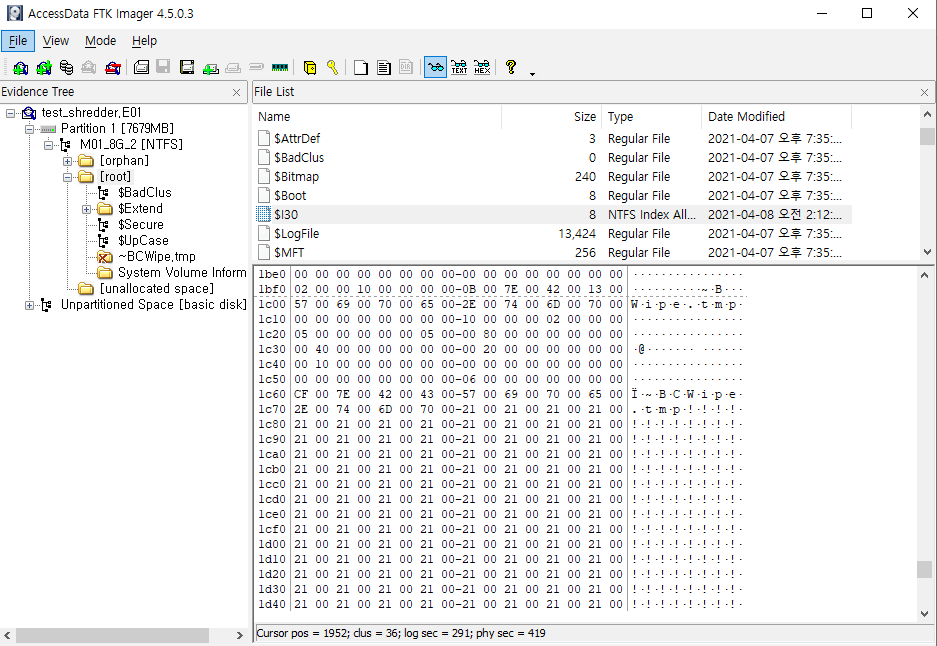 $130 파일에서 파일명이 “~BCWipe.tmp”이며 정보가 ‘!’로 덮어쓰기 된 데이터를 볼 수 있으며, 또한 [unallocated space] 디렉토리에서 와이핑되었던 데이터들이 존재함을 볼 수 있다.