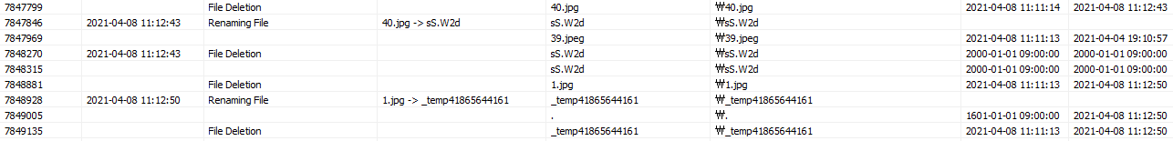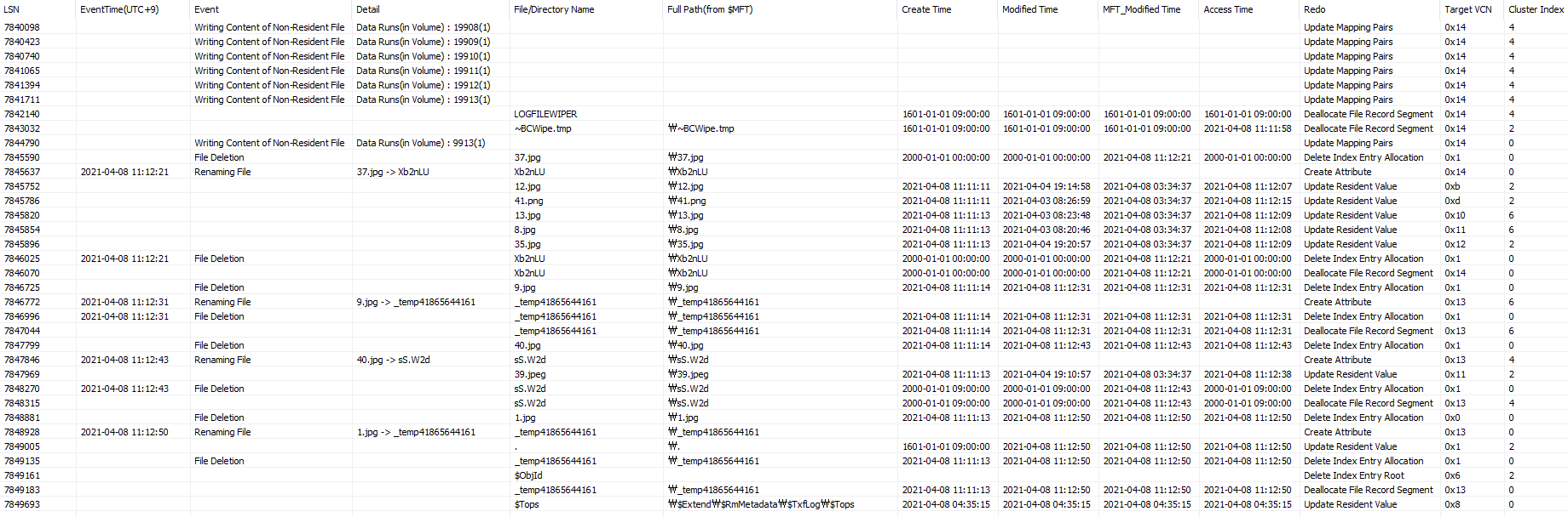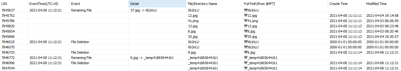 또한 $LOGFILE의 Event 속성이 File Deletion인 파일들을 보면 37.jpg->Xb2nLU, 9.jpg->_temp41865644161, 40.jpg->sS.W2d, 1.jpg->_temp41865644161로 파일명이 변경되었음을 알 수 있었다.