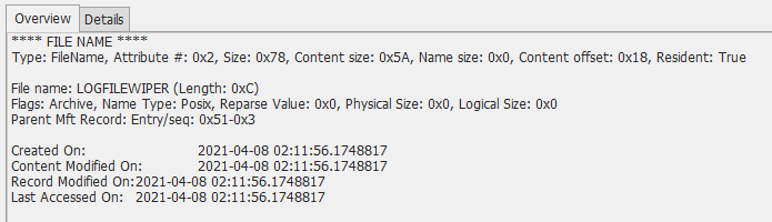 이것만으로 알 수 없었던 LOGFILEWIPER 파일의 삭제 시간은 $MFT 파일을 통해 얻을 수 있었으며 MFT Explorer를 이용해 $MFT를 분석하였다.