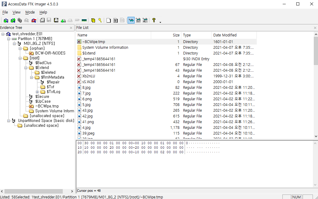 ▲ “~BCWipe.tmp”의 파일 이름과 의미 없는 값들로 덮여 쓰인 $I30 파일